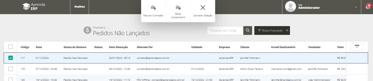 Assim, o sistema apresentará a listagem de todos os seus pedidos não faturados com as respectivas informações.
