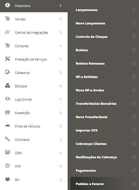 Para isso, você deverá acessar o menu lateral Financeiro, submenu Pedidos a Faturar.