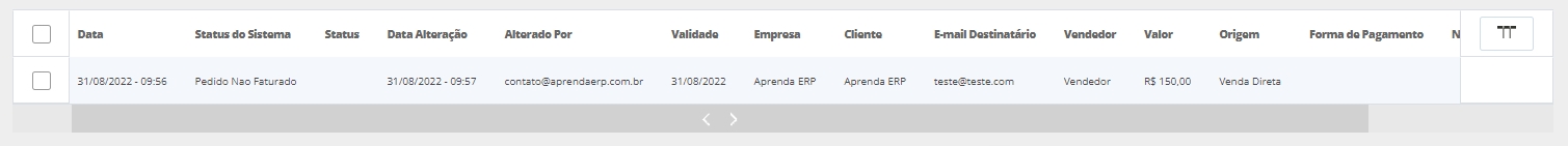 Código: o sistema apresentará o código do pedido; Data: o sistema apresentará a data de cadastro do pedido; Status do Sistema: o sistema apresentará o status do pedido, que neste caso será Pedido Não Faturado; Data Alteração: o sistema apresentará a data da última alteração do pedido; Alterado Por: o sistema apresentará e-mail do usuário que realizou a alteração; Validade: o sistema apresentará a validade do pedido; Empresa: o sistema apresentará o nome da empresa que gerou o pedido; Cliente: o sistema apresentará o cliente do pedido; Vendedor: o sistema apresentará o vendedor do pedido; Valor: o sistema apresentará o valor do pedido; Origem: o sistema apresentará a origem do pedido (PDV, Pedidos e Orçamentos, Venda Direta ou E-commerce); Status: o sistema apresentará o status da venda; E-mail Destinatário: o sistema apresentará o e-mail do cliente; Forma de Pagamento: o sistema apresentará a forma de pagamento informada na venda; Nº da NFe: o sistema apresentará o número da nota fiscal, se houver; Dados Recebimento E-mail: o sistema apresentará as informações de recebimento do e-mail, se enviado.