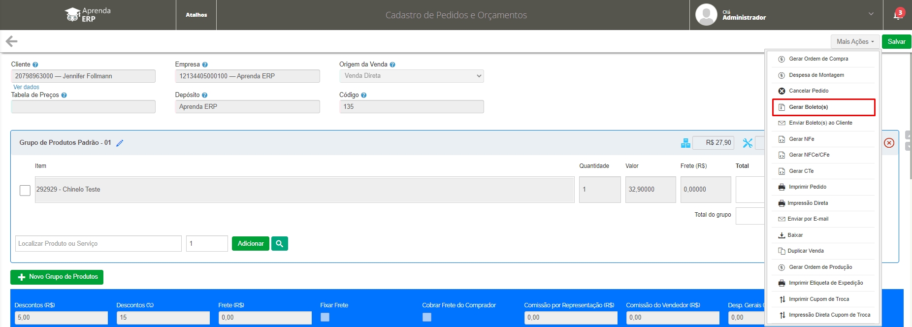 Você poderá gerar o boleto dentro do cadastro do pedido. Basta editá-lo e em Mais Ações, clicar em Gerar Boleto(s).