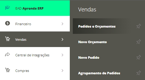 Para isso, acesse o menu lateral Vendas,submenu Pedidos e Orçamentos.