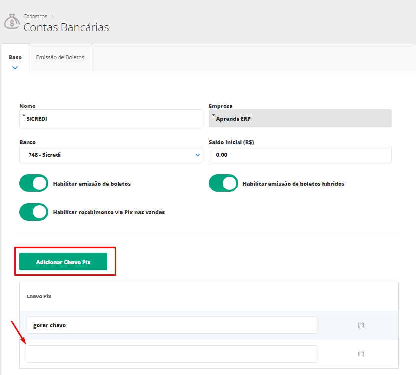 Se a conta bancária não esteja cadastrada dentro do ERP, acompanhe o artigo: Como cadastrar contas bancárias no Sistema ERP