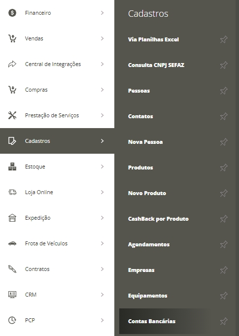 Para estar utilizando essa funcionalidade, acesse Menu Lateral Cadastros e em seguida, submenu Contas Bancárias