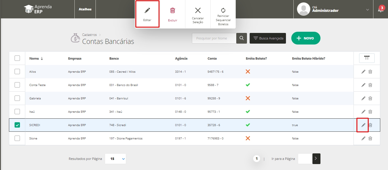 Se já possui uma conta bancária do Banco Sicredi cadastrada, edite selecionando a conta bancária e clique em editar ou clique no lápis de edição da conta cadastrada