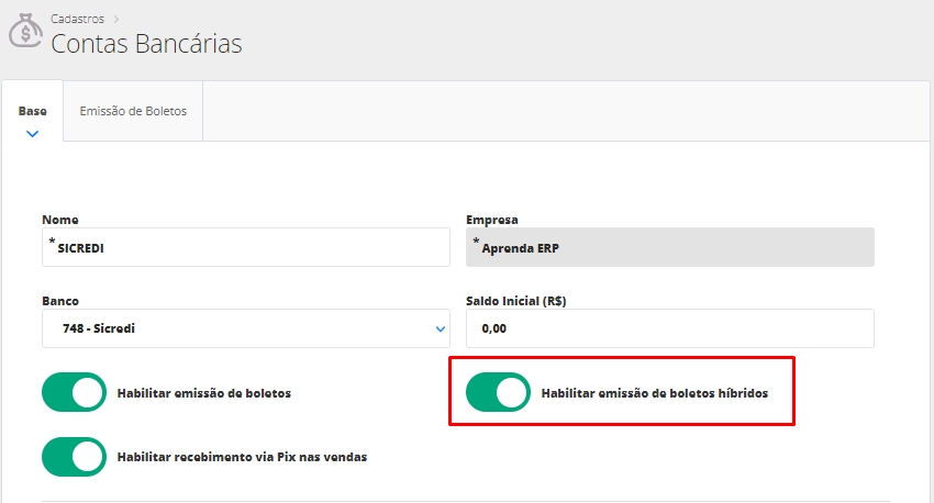 Na tela de edição da Conta Bancária, masque a opção de Habilitar emissão de boletos híbridos.