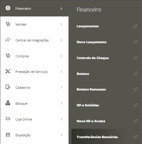 Através do menu lateral Financeiro, submenu Transferências Bancárias,você poderá acompanhar todas as suas transferências cadastradas no sistema.