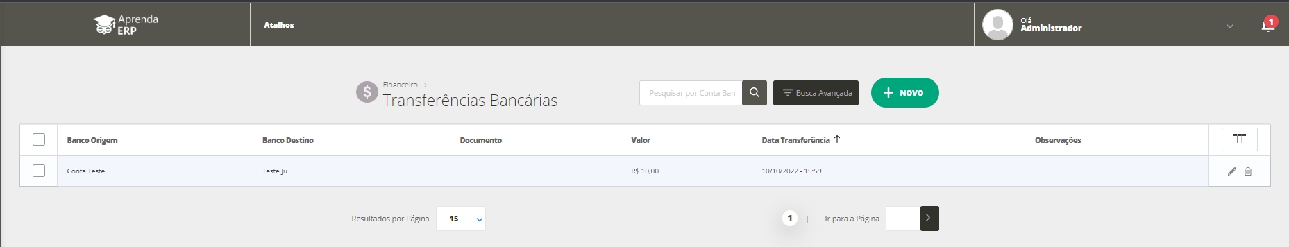 Banco Origem: o sistema informará a conta bancária que está realizando a transferência; Banco Destino: o sistema apresentará o banco informado como destino; Documento: o sistema apresentará o número informado por você como número do documento; Valor: o sistema apresentará o valor da transferência; Data Transferência: o sistema apresentará a data da transferência; Observações: o sistema apresentará a descrição informada, se houver.