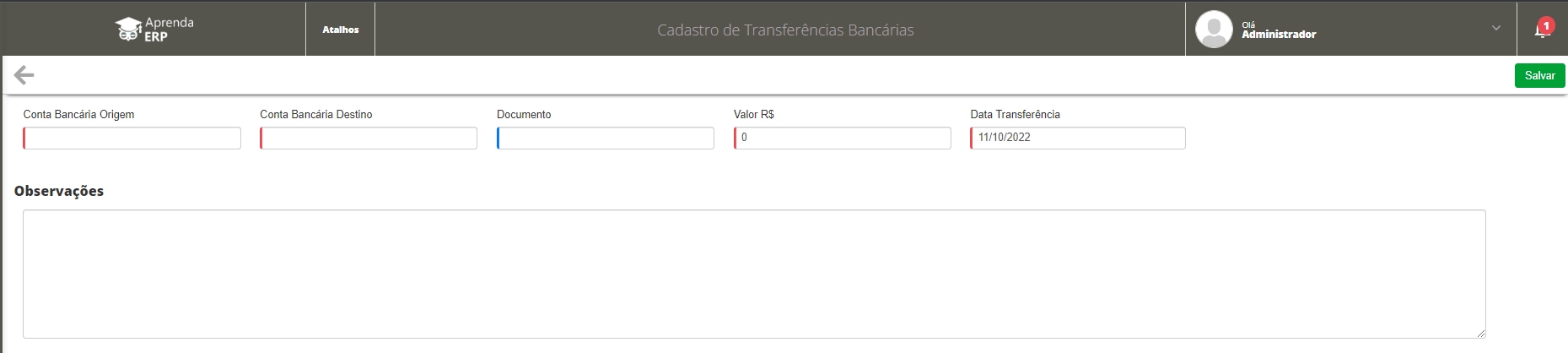 Conta Bancária Origem:selecione o banco responsável pela a movimentação financeira; Conta Bancária Destino:selecione o banco que receberá o valor da movimentação; Documento:informe um número para registrar a transferência; Valor R$:informe um valor em reais; Data Transferência: informe uma data para registrar a sua movimentação; Observações:faça uma descrição sobre o motivo desta transferência. Logo após, clique em Salvarpara que o sistema registre a sua nova movimentação financeira.