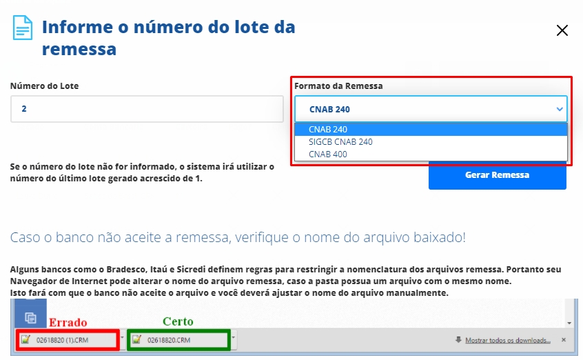 Após selecionar o CNAB correto, clique em Gerar Remessa. Assim, o sistema realizará o download automático do arquivo.