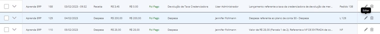 Mas além dessas, ainda tem outra forma de realizar o pagamento em outra data, que seria pela tela de edição do lançamento financeiro. Portanto, é necessário editar o lançamento financeiro, clicando no ícone de lápis.