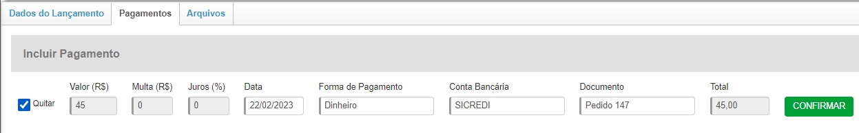 Agora, estando na tela de edição, vá até a aba Pagamentos. Assim como na possibilidade anterior, nesta também é necessário informar a datacorreta do devido pagamento e então, clicar em Quitar. Logo após, basta Confirmara operação e o pagamento já estará realizado na data definida.