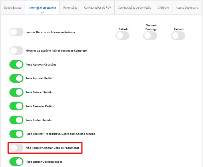 Mas antes de tudo, é importante que você como usuário, tenha permissão para realizar este procedimento. Portanto, o responsável por gerenciar usuários deve acessar o menu lateral Configurações, submenu Usuários, editar seu usuário, e na aba Restrições de Acesso, deve desabilitara opção Não Permitir Alterar Data de Pagamento.