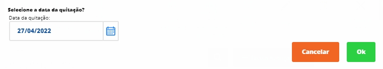 Assim, se abrirá um novo modal para você definir qual é a data correta da quitação. Após isto, basta clicar em OK e o lançamento será pago na data informada.