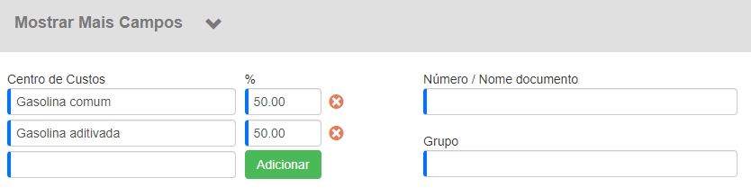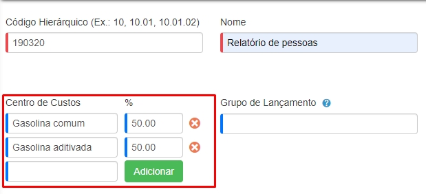 Logo, será possível perceber que o sistema apresenta junto ao centro de custo um campo de porcentagem, que será alterado de acordo com a adição de novos centro de custos.