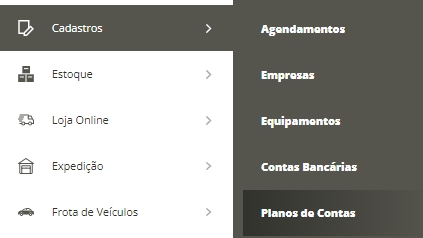 Você deverá acessar o menu lateral Cadastros, submenuPlanos de Contas.