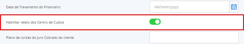 Feito isso, expanda a aba Financeiroe busque pela opçãoHabilitar rateio dos Centro de Custos,onde a mesma deverá ser habilitada e salvar a alteração. Dessa forma o sistema disponibilizará a opção para configuração.