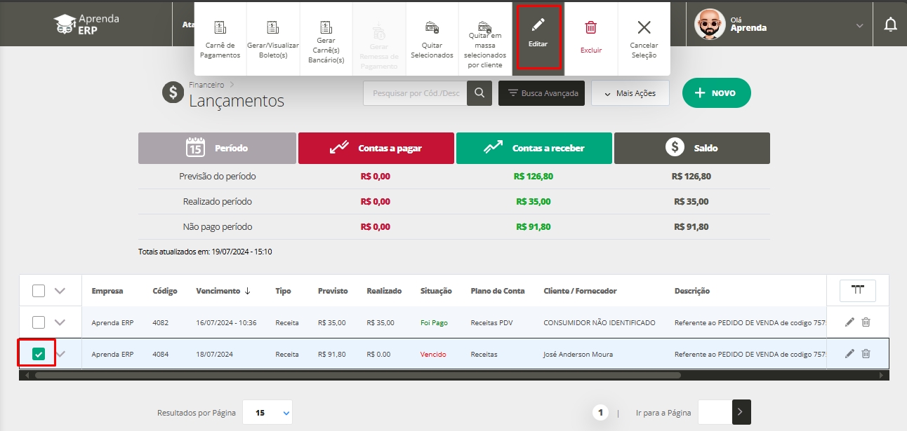 Ou também, pode selecionar o lançamento e clicando em editar.