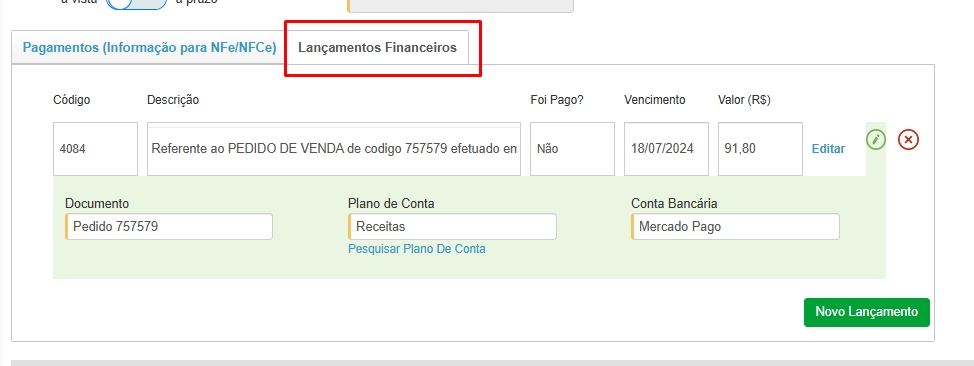 Edite a venda desejadas, e em seguida clique na aba Lançamentos Financeiros.