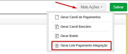 Na tela de edição, clique em Mais ações e em seguida Gerar Link de Pagamento Integração.