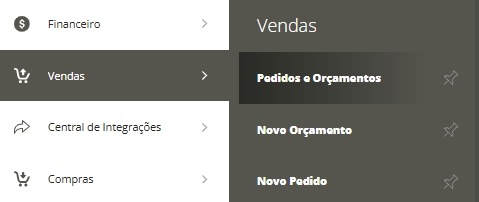 Acessando Menu Lateral Vendas e em seguida Submenu Pedidos e orçamentos.