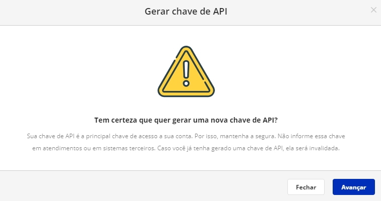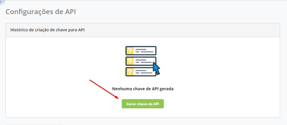 Na tela de histórico de Chaves API, irá visualizar se já possui alguma chave. Caso a sua conta não possua clique em Gerar Chave de API.