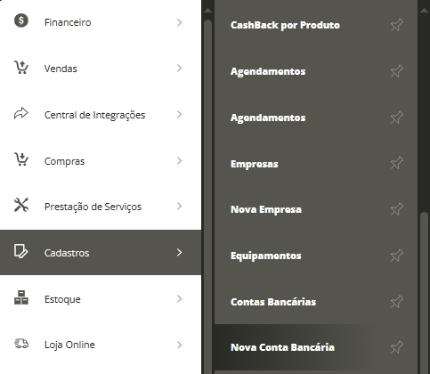 Acesse Menu Lateral Cadastrose em seguida o submenu Nova Contas bancárias.