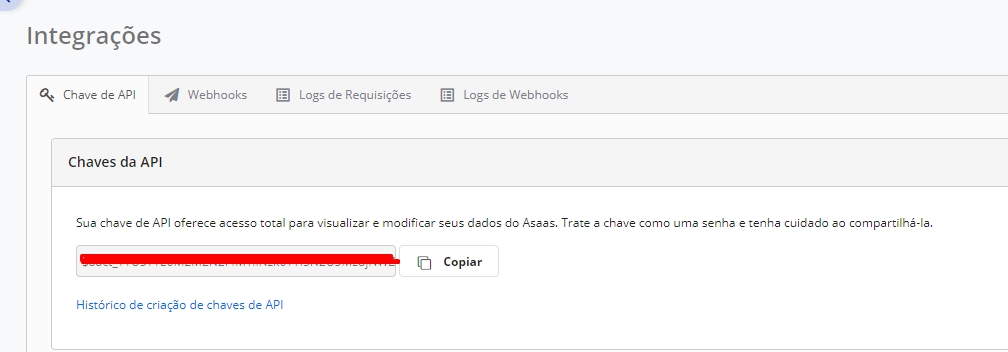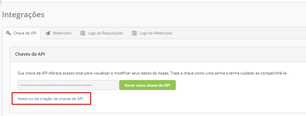 Feito isso, será direcionado a tela de Integrações, onde será necessário clicar em Histórico de criação de chaves de API para visualizar se sua conta já possui uma chave API ou se será necessário criar uma nova chave.