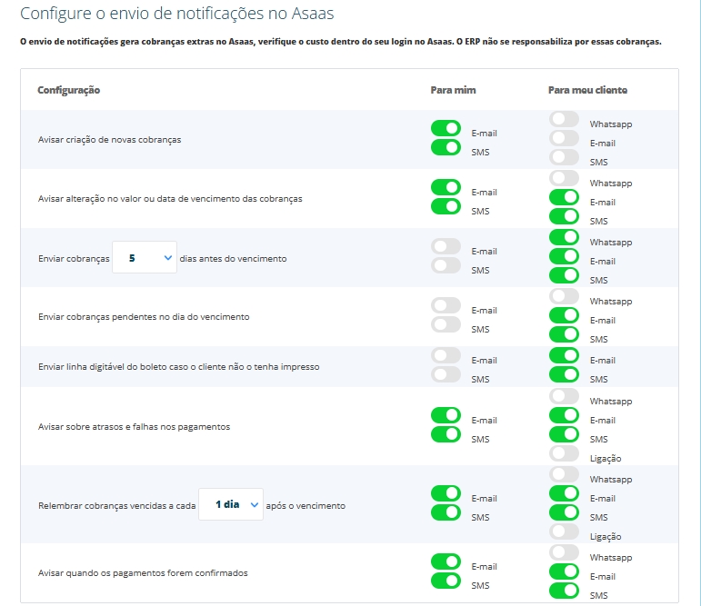 Usar envio de notificações de cobrança do Asaas: destaque essa opção se desejas que a plataforma Asaas efetue a notificação e cobrança dos boletos gerados através da integração.