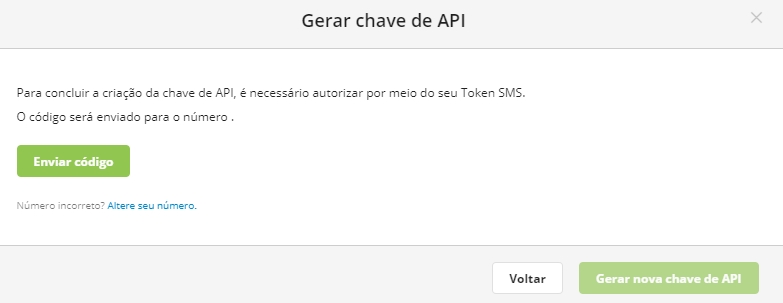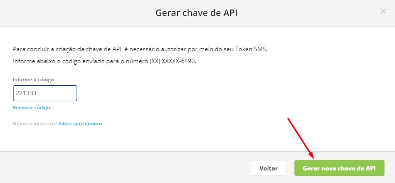 Ao clicar em Enviar código, o mesmo será enviado ao número registrado junto a sua conta. Digite o código que foi enviado e em seguida clique em Gerar nova chave API.