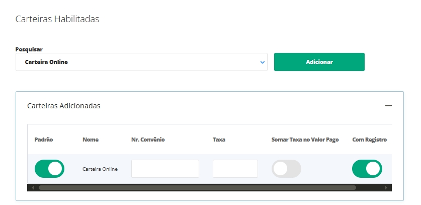 No campo Pesquisar, selecione dentre as alternativas, o tipo de carteira que irá utilizar e clique em Adicionar. Feito isso, será exibido o campo Carteiras Adicionadas, preencha as informações seguintes: