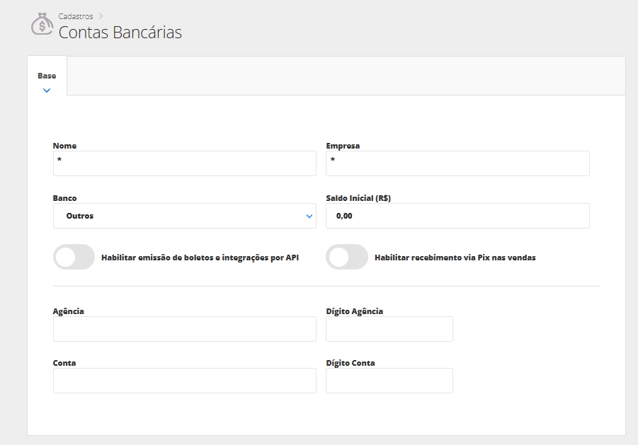 Saldo Inicial (R$): o saldo inicial consiste no valor disponível na conta da empresa. O preenchimento deste campo, possibilita o controle do seu saldo;