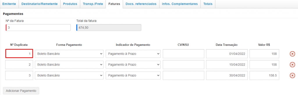 Para corrigir, você precisará editar sua NF-e e acessar a aba Faturas.