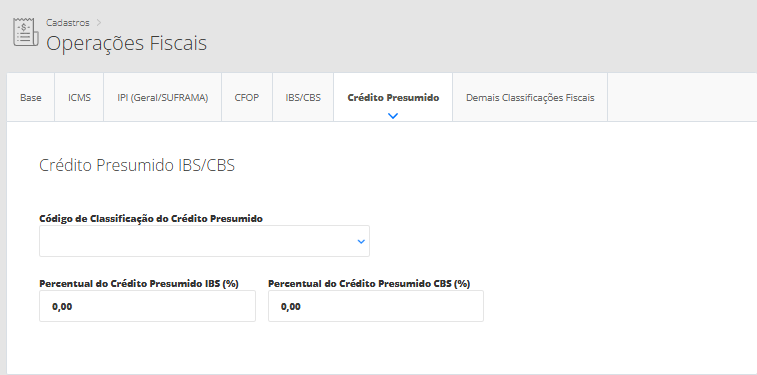 Percentual do Crédito Presumido CBS (%): Percentual do crédito presumido aplicável à CBS.
