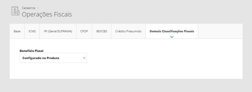 Neste campo será selecionado se o cmapo código do beneficio fiscal será informado no cadastro do produto ou então ou então diretamente na Operação Fiscal