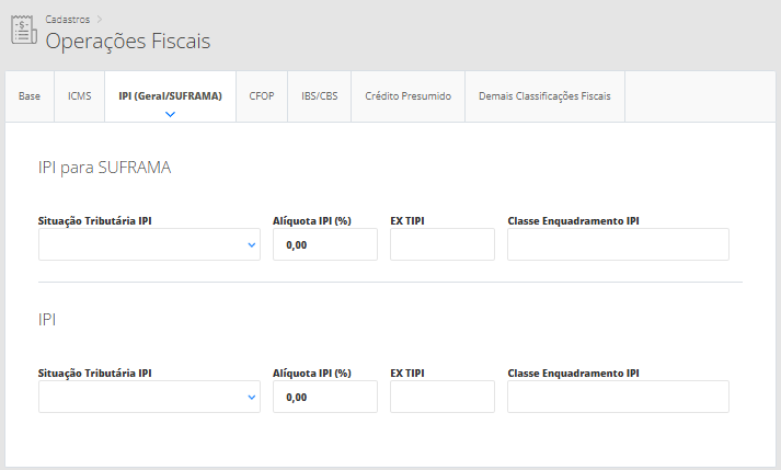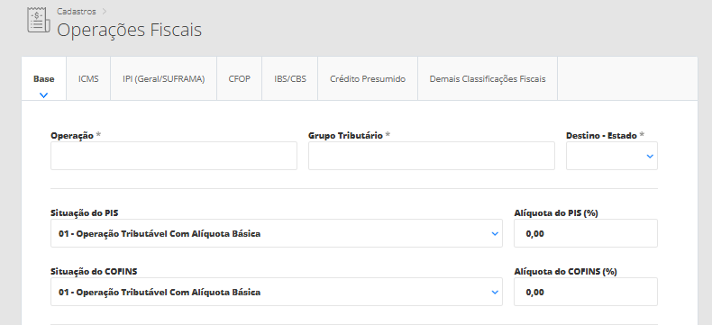 Agora, na tela de edição da operação fiscal, na aba Base, informe os seguintes campos: