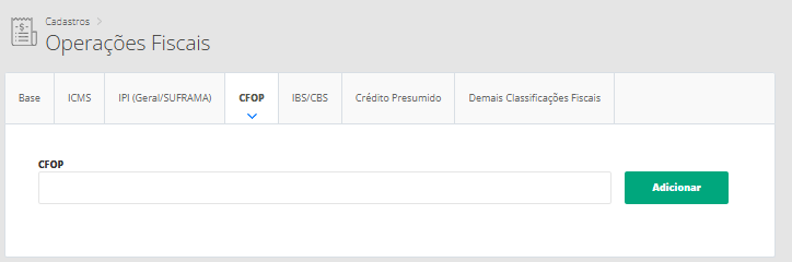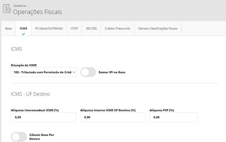Com a criação do grupo tributário e da categoria de venda em seu sistema, é possível configurar as operações fiscais. São nas operações fiscais que você irá mencionar todos os dados fiscais que terão seus produtos, como: ICMS, PIS, COFINS, IPI e CFOP.