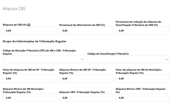 Alíquota da CBS – Tributação Regular (%): Percentual da alíquota da CBS aplicado quando a operação está no regime regular.
