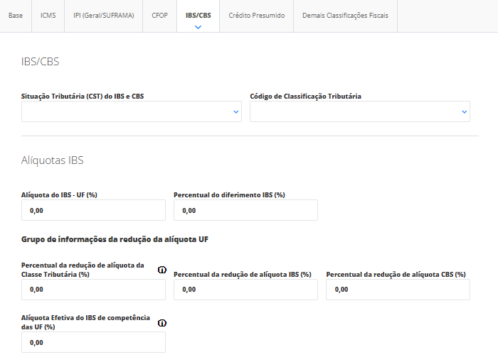 Percentual de Redução de Alíquota da Classificação Tributária da CBS (%): Percentual de redução aplicado à alíquota da CBS conforme a classificação tributária da operação.