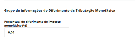 Percentual do diferimento do imposto monofásico (%): Percentual do imposto monofásico cujo pagamento será diferido, conforme previsão legal.