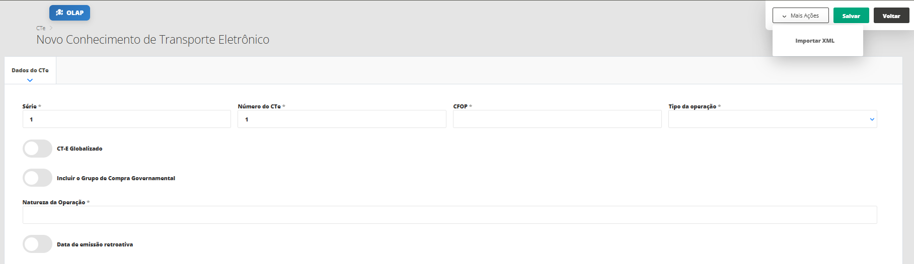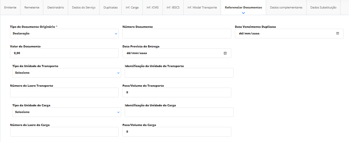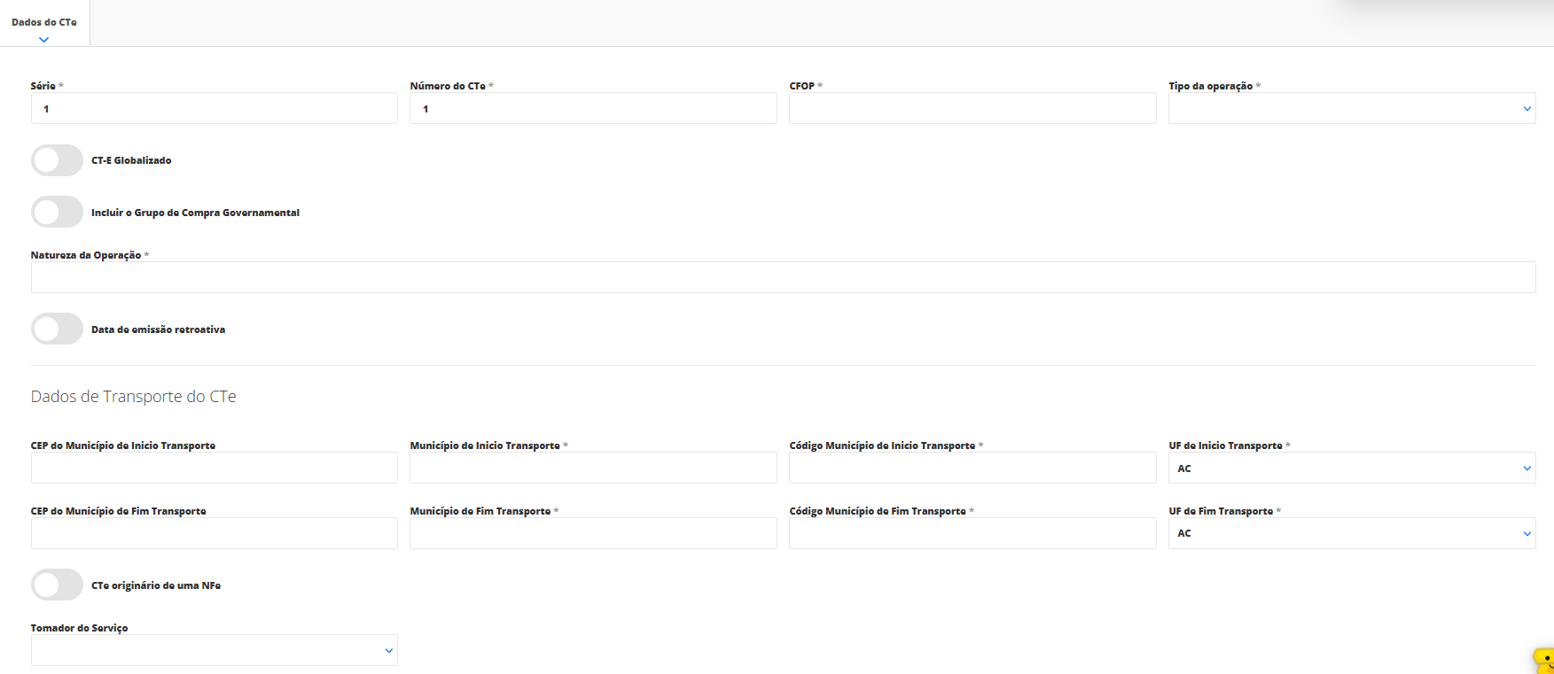 Agora, você será direcionado para a tela de geração do CT-e, em que contará com os seguintes campos para preenchimento.