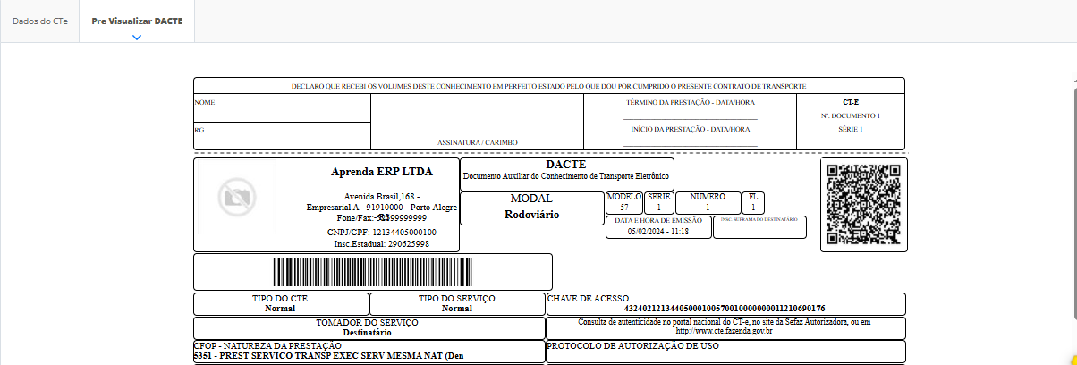 Depois disso, o sistema exibirá uma prévia do CT-e para você realizar novamente a verificação, e quando estiver correto, basta clicar em Emitir CT-e.