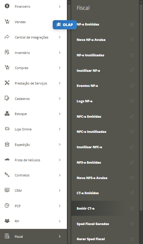 Agora, para emitir o CT-e, acesse o menu lateral Fiscal, submenu Emitir CT-e.