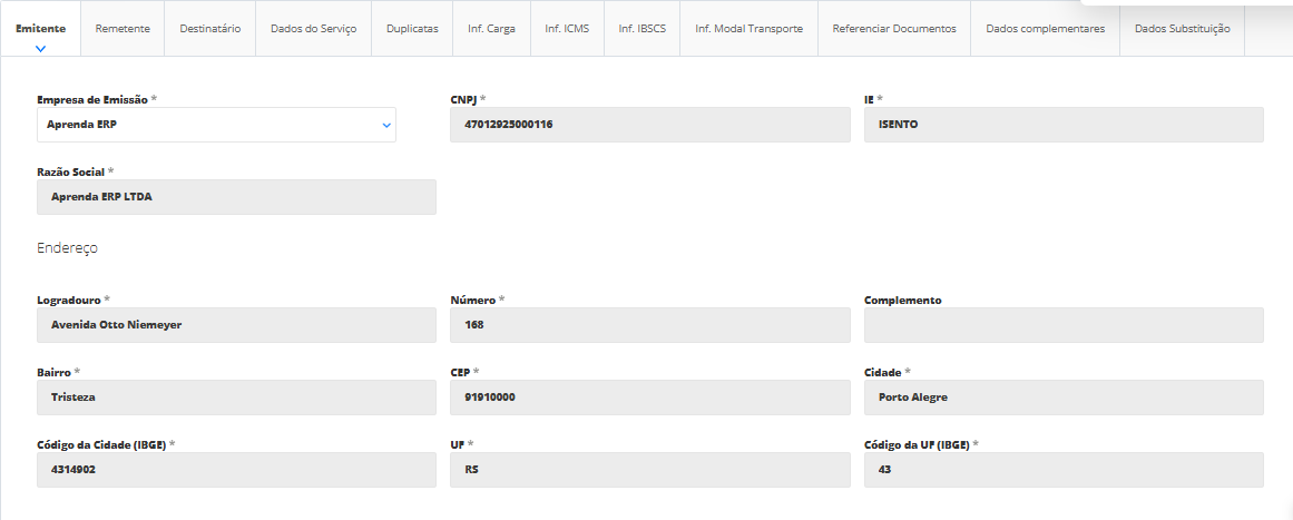 No primeiro momento você contará com a aba Emitente, que apresenta os dados da sua empresa que será a responsável por emitir o CT-e. Caso você gerencia mais de uma empresa no Sistema ERP, confirme se foi informada a empresa correta nesta seção.
