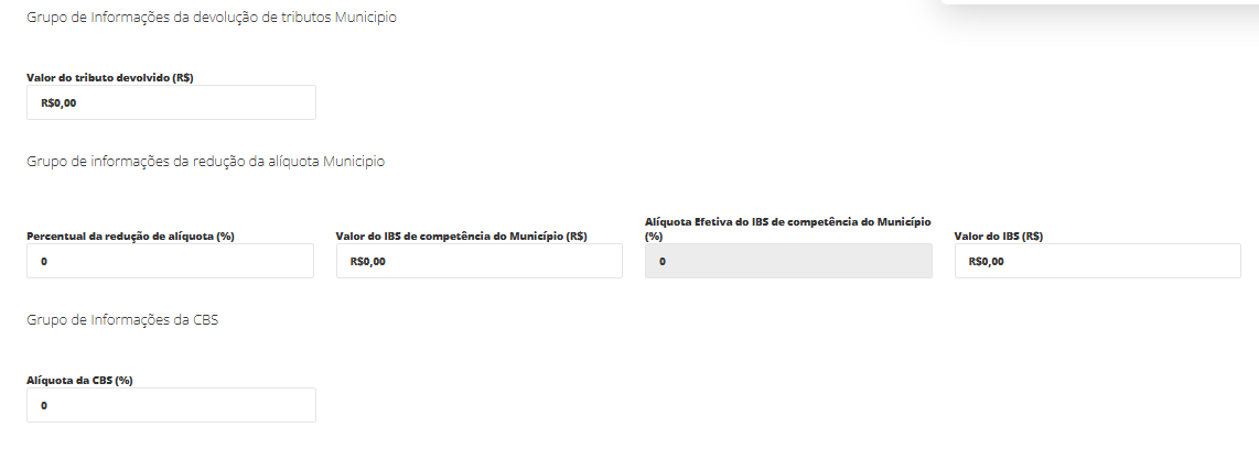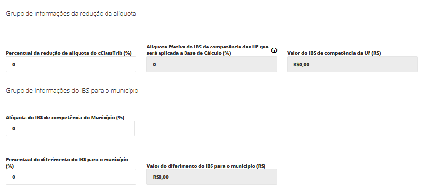 Conjunto de campos utilizado quando a operação possui redução de alíquota prevista em legislação específica. Deve ser preenchido somente quando houver benefício fiscal aplicável, pois impacta diretamente o cálculo do IBS.