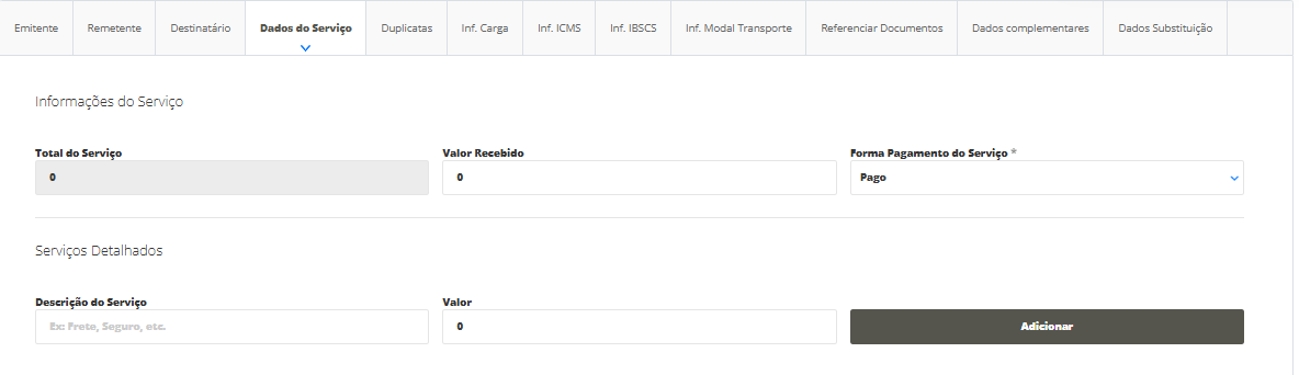 Logo após, na aba Dados do Serviço você deverá preencher o valor recebido pelo frete e se o mesmo já se encontra como pago ou possui alguma pendência.