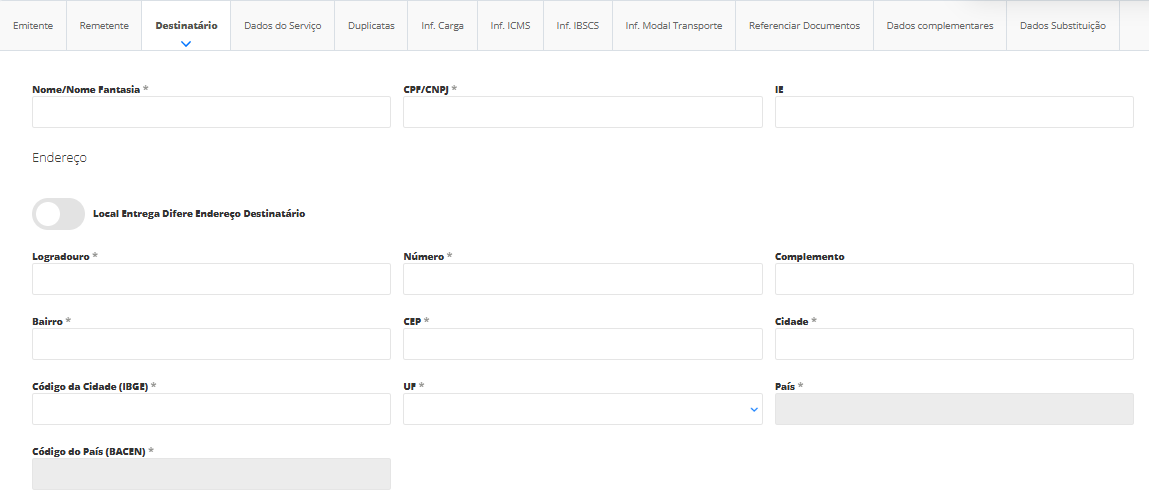 A opção Recebedor será habilitada apenas com a seleção do checkbox Local Entrega Difere Endereço Destinatário, na aba Destinatário.