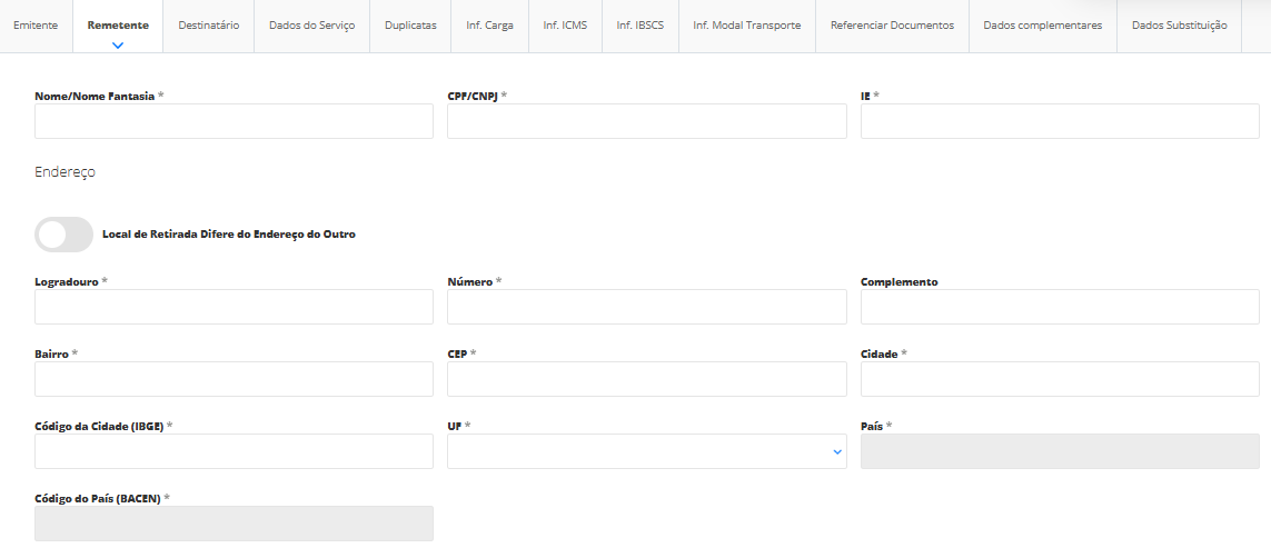 A opção Expedidor será habilitada apenas com a seleção do checkbox Local de Retirada Difere do Endereço do Remetente, na aba Remetente;