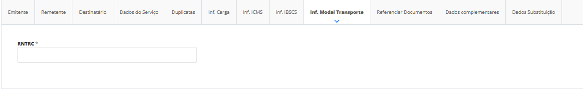 A seguir, na aba Inf. Modal Transporte, informe o código de Registro Nacional de Transportadores Rodoviários de Carga (RNTRC). Caso você já tenha registrada esta informação no cadastro da sua empresa, será informado automaticamente o respectivo código neste campo.