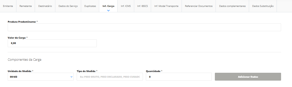 Ainda na mesma tela, na seção Componentes da Carga informe a unidade, o tipo de medida e sua respectiva quantidade dos itens.