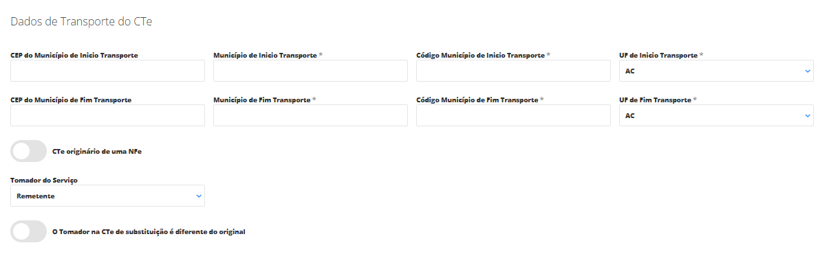 Logo abaixo o sistema exibe os campos de transporte para que você preencha de acordo com dados do municípios de início e fim do transporte. No final desta seção você encontra o campo CTe originário de uma NF-e, que você poderá habilitar se este for o caso, e ao lado, o campo Tomador do Serviço, que você poderá escolher entre as opções disponíveis, quem será o responsável pelo pagamento do frete. Será possível escolher entre as seguintes opções: Remetente, Expedidor, Recebedor e Destinatário.
